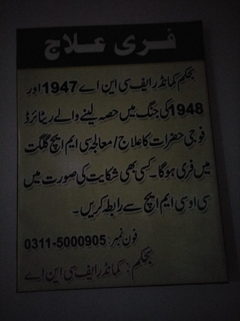 اس تقریب میں شرکت کرنے کےلیے میرے دادا بھی 5 گھنٹے کا طویل سفر طے کر کے یاسین تھوئی سے گلگت شہر آگئے تھے اور سخت موسم کی وجہ سے علیل ہوگئے. ہمیں بتایا گیا تھا کہ آپ کی خصوصی احکامات پر 1947 اور 1948 کے غازیوں کو CMH میں مفت علاج کیا جاتا ہے اور تمام سہولیات مہیا کئے جاتے ہیں. آپ کی ان ہدایات کو فریم بنا کر CMH کی دیوار پر بھی آویزاں کیا گیا ہے. ابتدا میں اس فریم کو دیکھ کر بہت خوشی ہوئی اور میرے گھر والوں نے آپ کو دعائیں دیں. دادا جان کی صحت بہتر نہیں ہوئی تو ہم نے آپ کے نمائندوں سے گزارش کی کہ ہمیں ایمبولنس فراہم کیا جائے تاکہ دادا کو ہسپتال پہنچا سکیں. جسے رد کیا گیا اور بتایا گیا کہ ہسپتال پہنچنے کے بعد "بہترین” علاج کیا جائے گا اور بزرگ کا خصوصی خیال رکھا جائے گا. ہسپتال میں کچھ دیر ایمرجنسی میں رکھا گیا اور پھر ایک ہال میں منتقل کیا گیا. ہال پہنچنے پر ہی وہاں ڈیوٹی پر معمور سپاہی نے ہمیں ائیر فریشنر لانے کا حکم جاری کردیا.