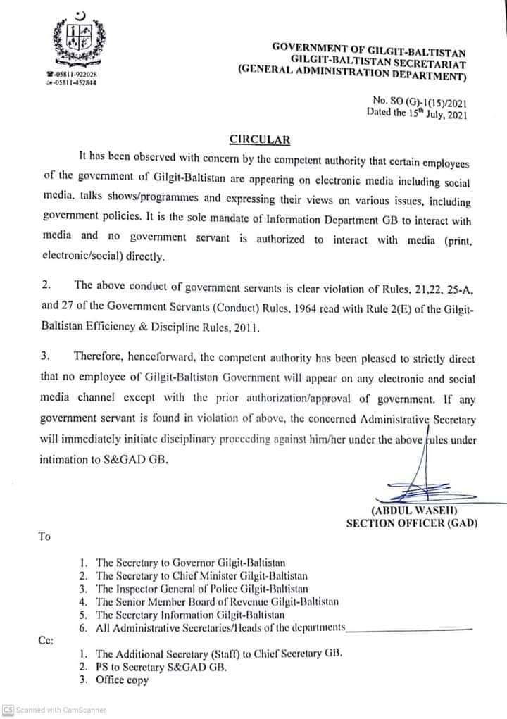 گلگت بلتستان حکومت نے سرکاری ملازمین کے متعلق پرنٹ، الیکٹرونک اور سوشل میڈیا پر آنے کے حوالے سے ایک نوٹیفکیشن جاری کیا۔ اور میڈیا میں اپنے خیالات و افکار کے اظہار پر پابندی عائد کر دی۔مختلف اہل علم نے اس پر اپنے خیالات و خدشات کا اظہار کیا۔