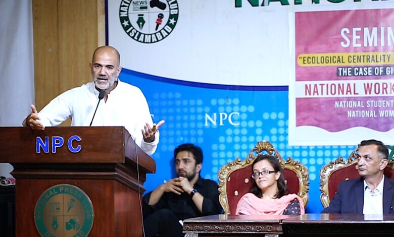 اسلام آباد: نیشنل ورکرز فرنٹ گلگت بلتستان اور نیشنل سٹوڈنٹس فیڈریشن گلگت بلتستان نے اسلام آباد پریس کلب میں ماحولیاتی مرکزیت اور گلگت بلتستان میں سیاسی پسماندگی کے موضوع پر ایک سیمینار کا انعقاد کیا۔ سیمینار میں گلگت بلتستان و پاکستان سے تعلق رکھنے والے نامور سیاسی رہنماؤں اور ماحولیات کے ماہرین سمیت نوجوانوں کی ایک کثیر تعداد نے شرکت کی۔ مقررین میں آبی معاملات کے ماہر حسن عباس، پروفیسر ڈاکٹر عاصم سجاد، ڈیولپمنٹ ماہرین صفی اللہ بیگ اور علی احمد جان، محقق ڈاکٹر نیلم نگار بیگ اور گلگت بلتستان سے تعلق رکھنے والے صحافی ارشد حسین شامل تھے۔