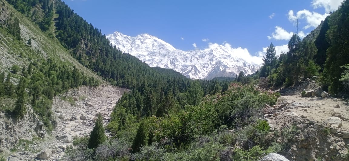 براڈ ویو ہوٹل میں دوپہر تین بجے لنچ کیا۔سیف الرحمان نے چکن کڑاہی کیساتھ سونچل سبزی،لسی اور مکئی کی روٹی کا انتظام کیا تھا۔تھکاوٹ کیساتھ بھوک اور ہماری پسندیدہ لوکل ڈش، واہ کیا کہنا۔ملک کے دیگر حصوں سے تشریف لانے والے سیاح ایک دفعہ سونچل سبزی، مکئی کی روٹی اور لوکل بنی لسی کو ضرور انجوائی کریں۔یہ گلگت بلتستان کی یونیک ڈش ہے جو ہر گھر میں پسند کی جاتی ہے۔ آجکل شہروں میں نایاب ہے البتہ دیہاتوں میں آسانی سے اس کا انتظام ہوجاتا ہے۔فیری میڈوز کے ہوٹل انتظامیہ کو سونچل، مکئی اور لسی کو نیشنل اور انٹرنیشنل سیاحوں کے لیے ایک مقامی ڈش کے طور پر مستقل مینو کا حصہ بنانا چاہیے۔ اسے مقامی لوگ سبزیاں اُگا کر ٹھیک ٹھاک کماسکتے ہیں اور سیاحوں کے لیے بھی ایک یونیک ڈش انجوائی کرنے کاموقع ملے گا۔ لنچ کے بعد تھوڑا ساآرام کرنے کا ارادہ تھا، دفعتا ہم ہوٹل کے ویو پوائنٹ سے نانگا پربت کی چوٹی، نانگا پربت گلیشئر،گھنے جنگلات، بہتے پانوں اور نیلگوں آسمان کا نظارہ کرنے بیٹھ گئے۔یہ نانگا پربت اور رائے کوٹ گلشیئر کو باقاعدہ پہلا نظارہ تھا۔جو کچھ ہم دیکھ رہے تھے وہ الفاظ میں بیان کرنے سے قاصر ہیں۔ لبنی بھی بہت ہی لطف اندوز ہورہی تھی۔ فطرت کی ہزاروں پرتیں ہوتی ہیں۔آج فطرت اپنی تمام پرتوں کیساتھ ہمارے سامنے براجمان تھی۔ اسی سحر میں کھوئے ہوئے تھے ،سیف الرحمان نے آواز دی کہ ہم ابھی فیری میڈو گراؤنڈ کی طرف جائیں گے، شام کو واپسی ہوگی۔ میں نے کہا کہ جرگہ دار برکت اللہ سے بھی آج ہی ملنا ہے۔
