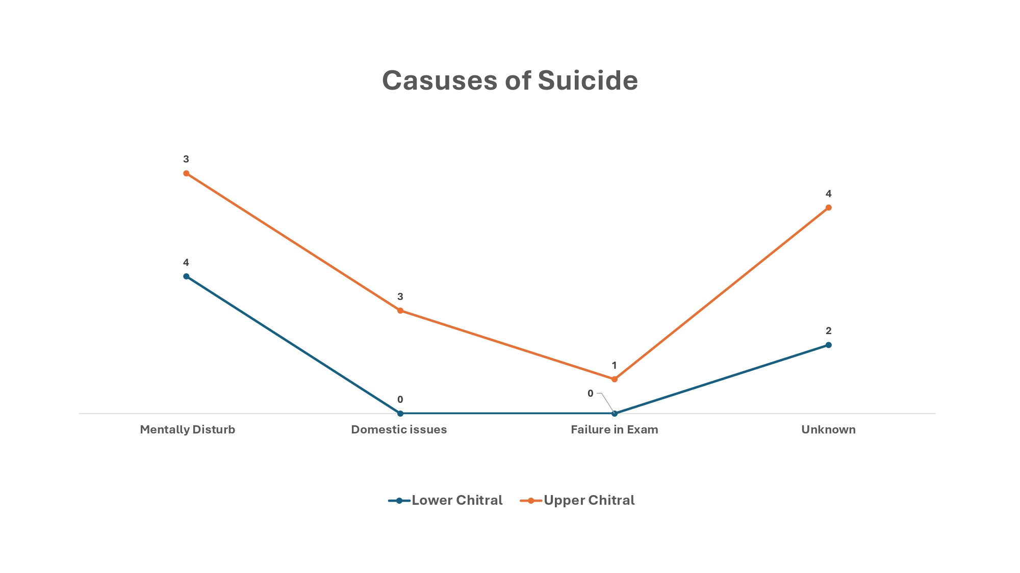 دوسری جانب، لوئر چترال میں سال 2025 کے دوران 14 سے 30 سال کی عمر کے افراد میں 5 خودکشیاں رپورٹ ہوئیں۔ اگرچہ تعداد اپر چترال سے کم ہے، لیکن یہ بھی ایک تشویشناک امر ہے۔ مزید برآں، لوئر چترال میں تین خواتین نے خودکشی کی، جو کہ کسی بھی معاشرے کے لیے باعثِ تشویش اور لمحۂ فکریہ ہے۔
