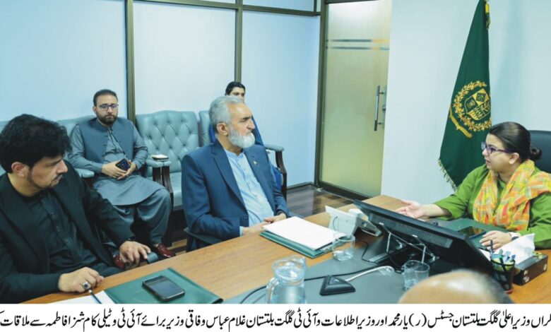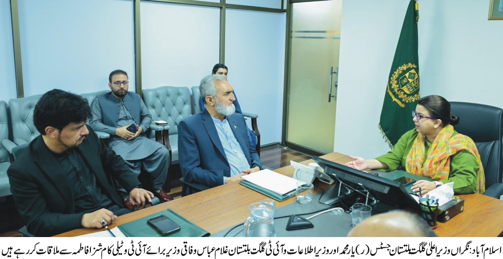 ان خیالات کا اظہار انہوں نے وزیر اطلاعات و آئی ٹی گلگت بلتستان غلام عباس کے ہمراہ وفاقی وزیر برائے آئی ٹی و ٹیلی کام شزا فاطمہ سے ملاقات کے دوران کیا۔ ملاقات میں ملک میں ڈیجیٹل تبدیلی کے عمل اور گلگت بلتستان میں ٹیکنالوجی کے فروغ سے متعلق اہم امور پر تفصیلی تبادلہ خیال کیا گیا۔