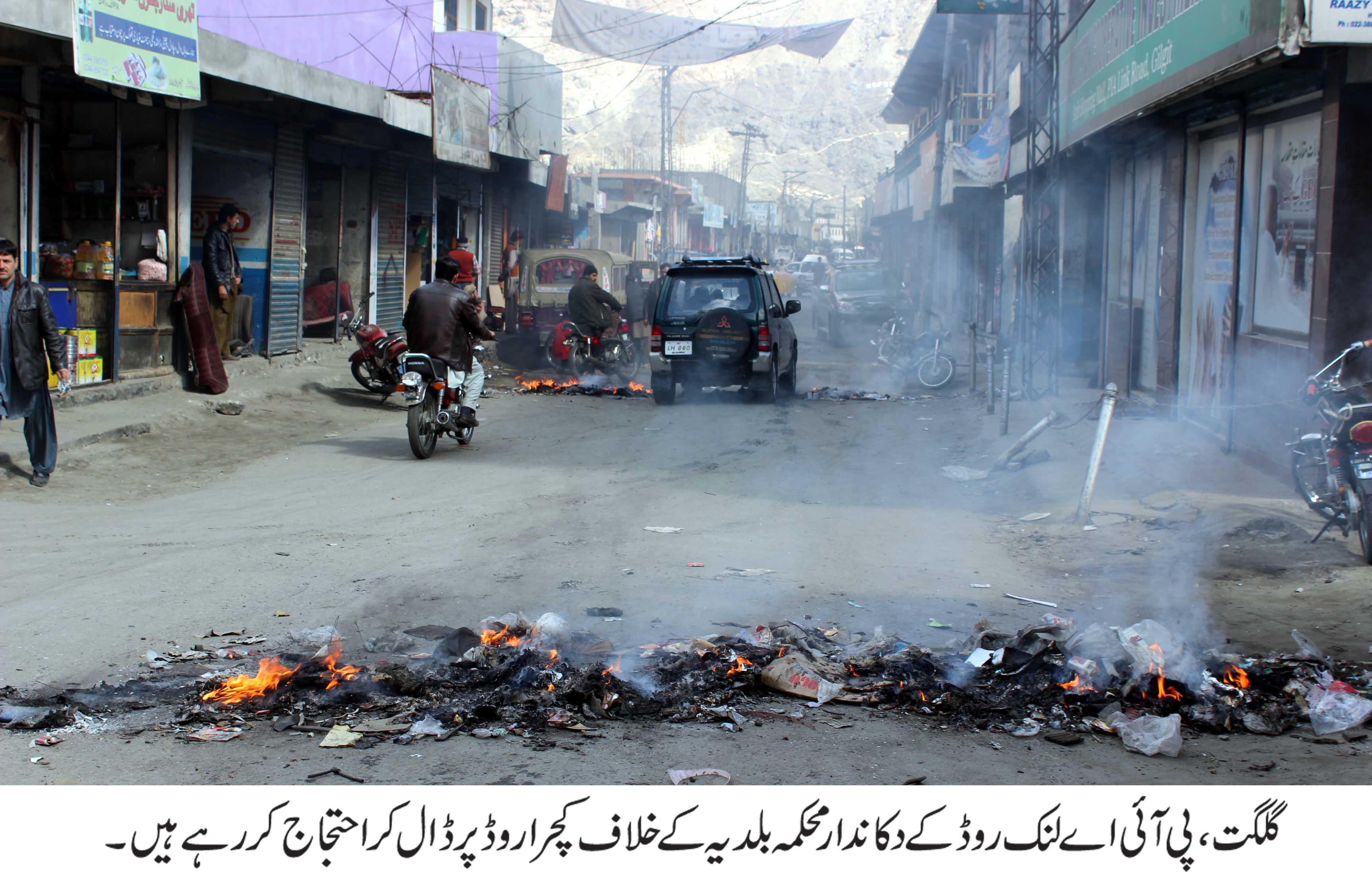 محکمہ بلدیہ گلگت کے خلاف تاجروں کا احتجاج، کچرا روڑ پر پھیلا کر آگ لگا دی
