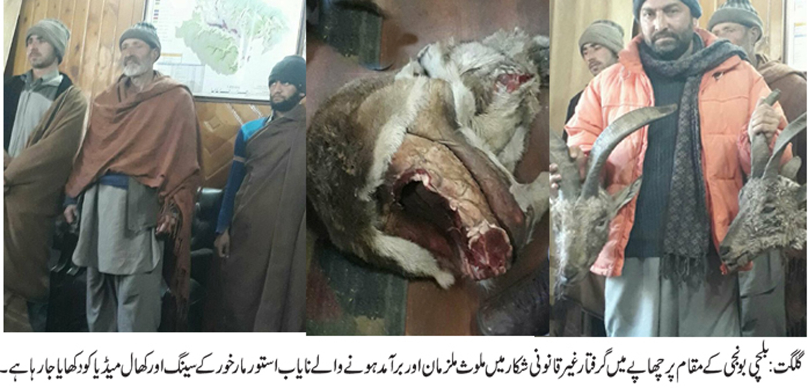 محکمہ وا ئلڈ لا ئف نے بلچی بو نجی کے مقا م پر چھا پہ ما ر کر نا یا ب نسل کے د و استور ما ر خور کے غیر قا نو نی شکا ر میں ملو ث تین افرا د کو گر فتا ر کر لیا